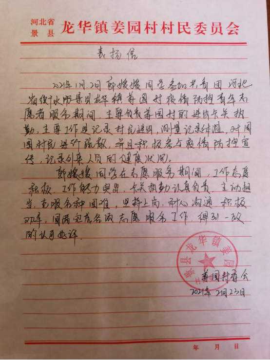 新型冠状病毒感染的肺炎疫情时刻牵动着大家的心,疫情就是命令,防控就是责任,郭媛媛愿意积极参与疫情防控的志愿活动,用实际行动为国家社会尽自己的一点微薄之力。2021年1月20日开始,郭媛媛在姜园村口每天帮助记录村口处的进出人员,帮助村民们测量体温。不怕吃苦,不怕艰难,面对寒风刺骨依然站在村口为人民服务,并且积极参与疫情防控宣传,在服务期间,工作态度积极,工作能力突出,卡关执勤认真负责。