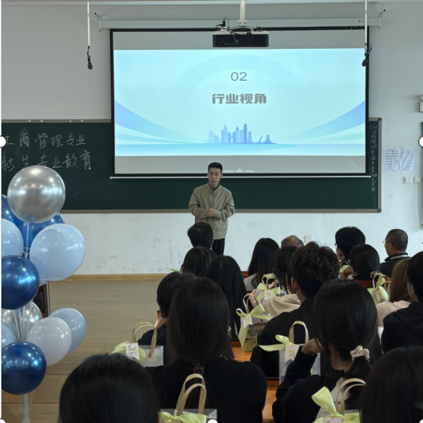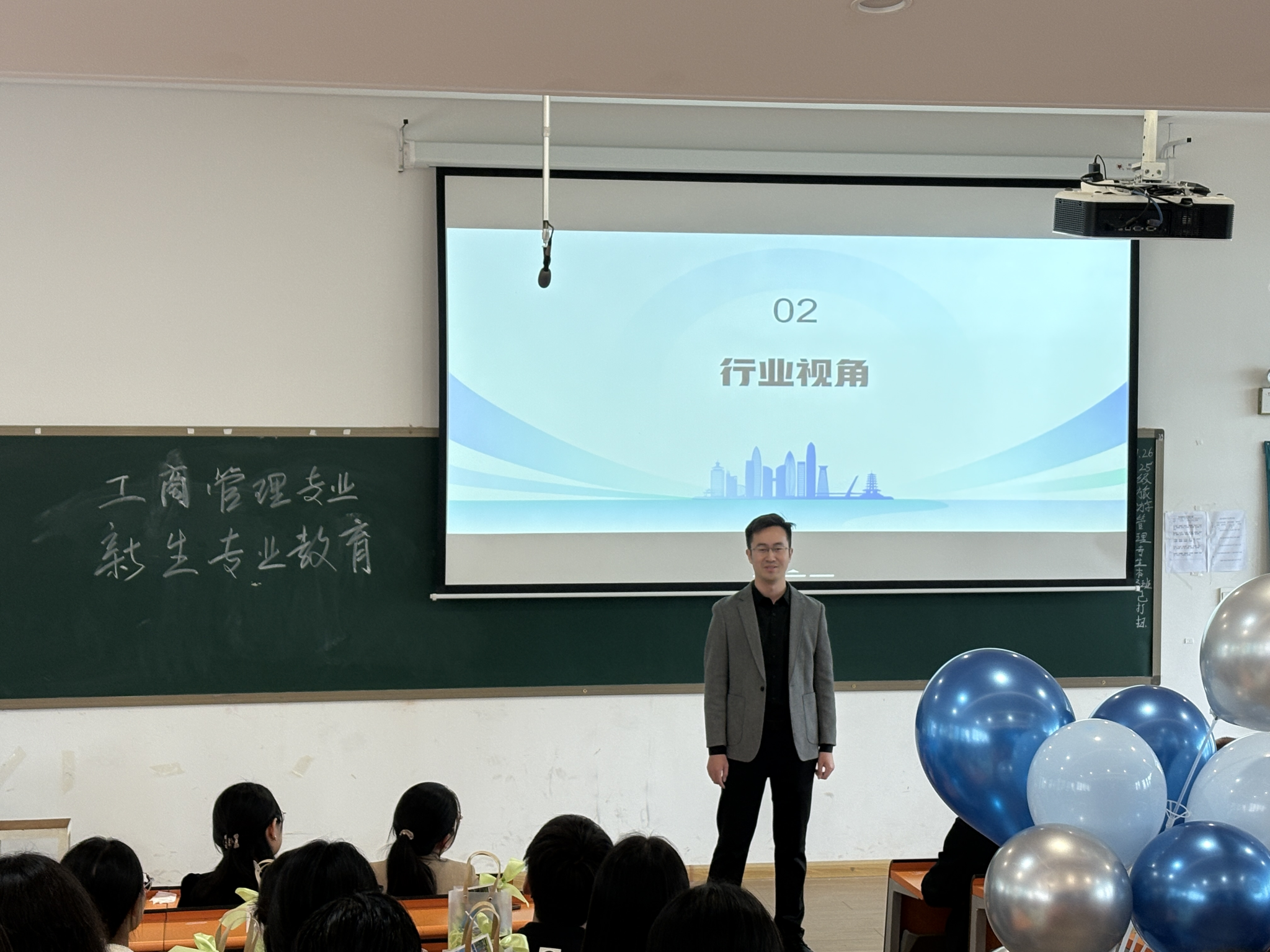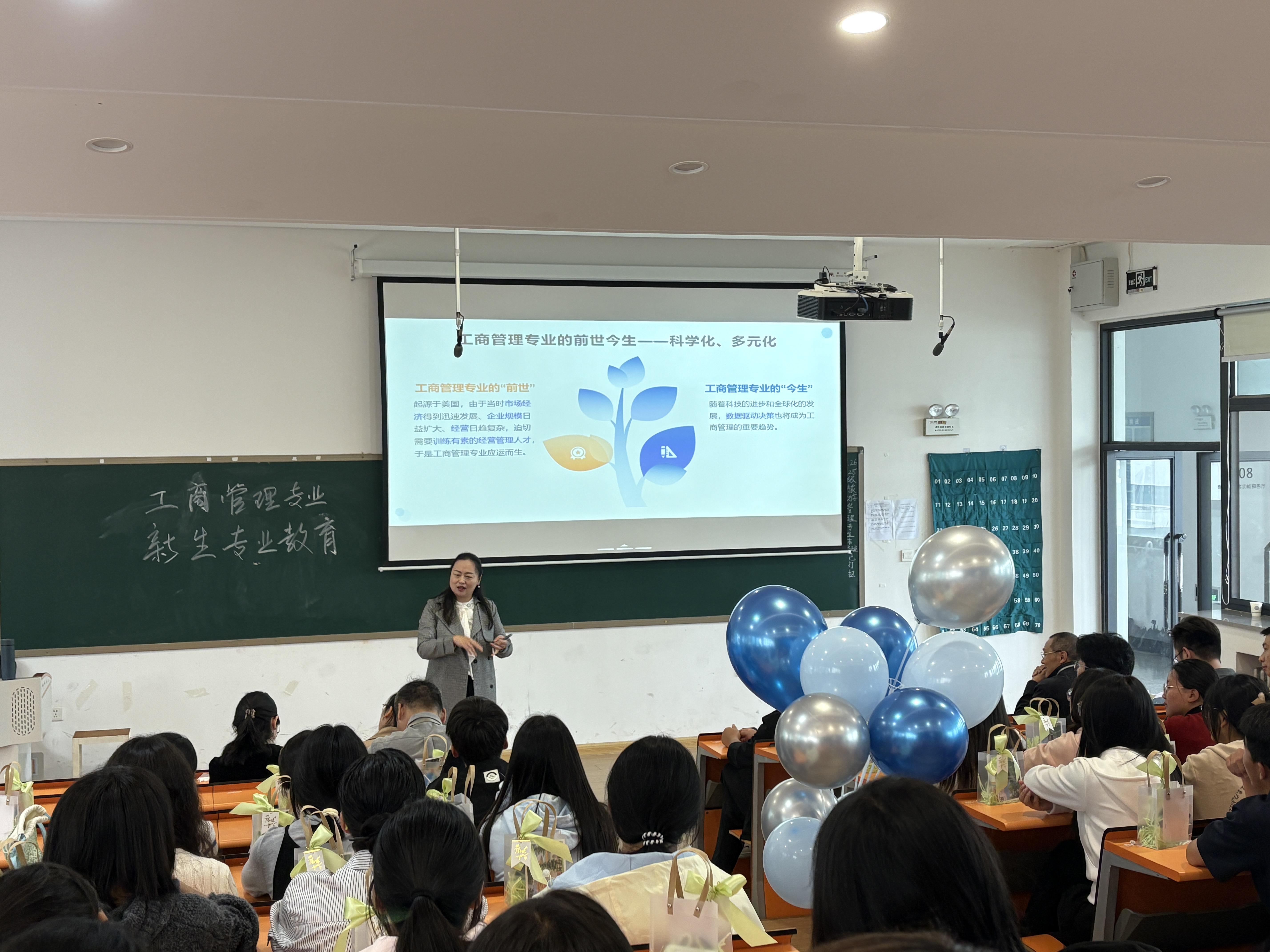 首先,李向民教授介绍了活动流程,包括专业解读、行业视角、经验分享、专业导师介绍及互选等环节,并以幽默的交流互动方式迅速拉近师生距离,激发起新生的参与热情。随后,董芳芳主任以《走进工商管理多彩世界——你的未来是“管”出来的》为主题,围绕“工商管理专业是什么、培养什么样的人才、如何培养人、可以做什么”四大核心问题,为新生带来了全面而有深度的专业解读,并结合行业发展趋势,介绍了专业的课程体系,梳理了学生未来发展方向。新生听后备受鼓舞,增强了专业信心,明确了学习目标。现场还设置了互动交流环节,鼓励学生积极参与、深入思考。