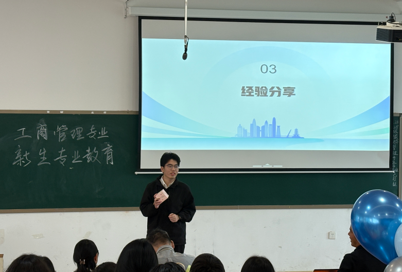 接着,优秀毕业生代表郑州市次空间科技有限公司董事长李金思、郑州氪宅科技有限公司董事长金永辉,以个人鲜活的职场经历,生动讲述了从校园到职场的角色转变,鼓励新生提前明确职业方向,珍惜大学时光,广泛学习专业知识,提升实践技能。优秀学生代表杨文豪、王怡菲围绕“如何思考、如何学习、如何进步、如何成才”等新生普遍关心的问题展开分享,鼓励新生要勇敢尝试、积极参加学科竞赛和科研项目。现场气氛热烈,掌声连连。最后董芳芳主任向新生们介绍了工商管理专业导师制——每位学生均配备专业导师,由导师帮助解决学习中的困惑与问题。