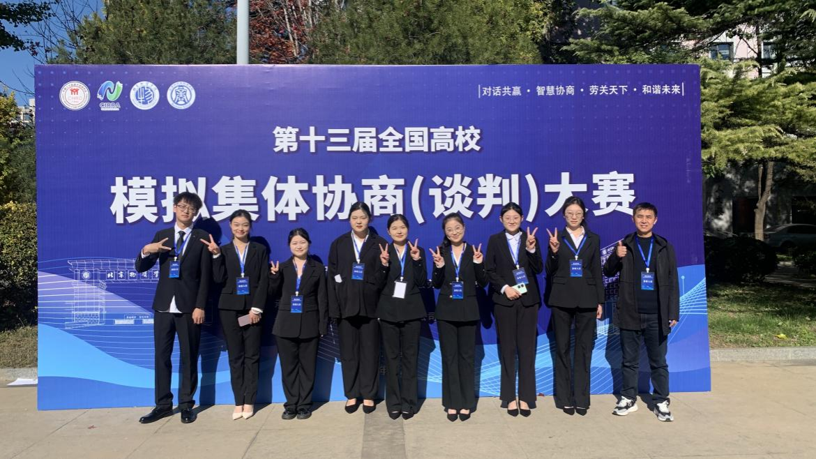 第十三届全国高校模拟集体协商(谈判)大赛于2025年11月1日至2日在北京物资学院举办。大赛由中国人力资源开发研究会劳动关系分会主办,北京物资学院商学院承办。我校管理学院人力资源管理专业选派资方、劳方两支代表队,共8名学生,由王军旗老师带队参赛。
