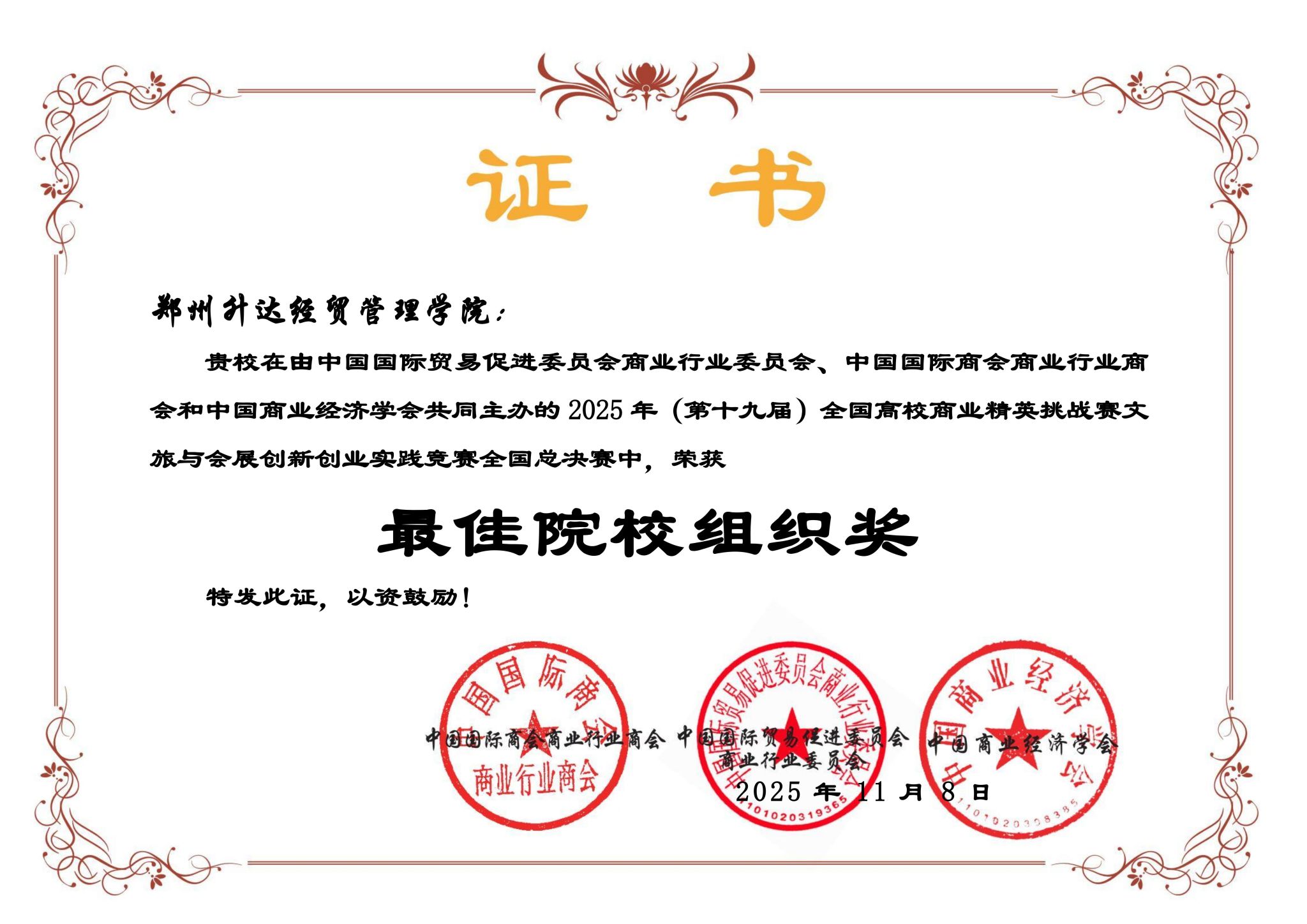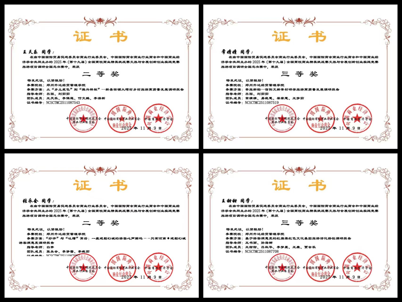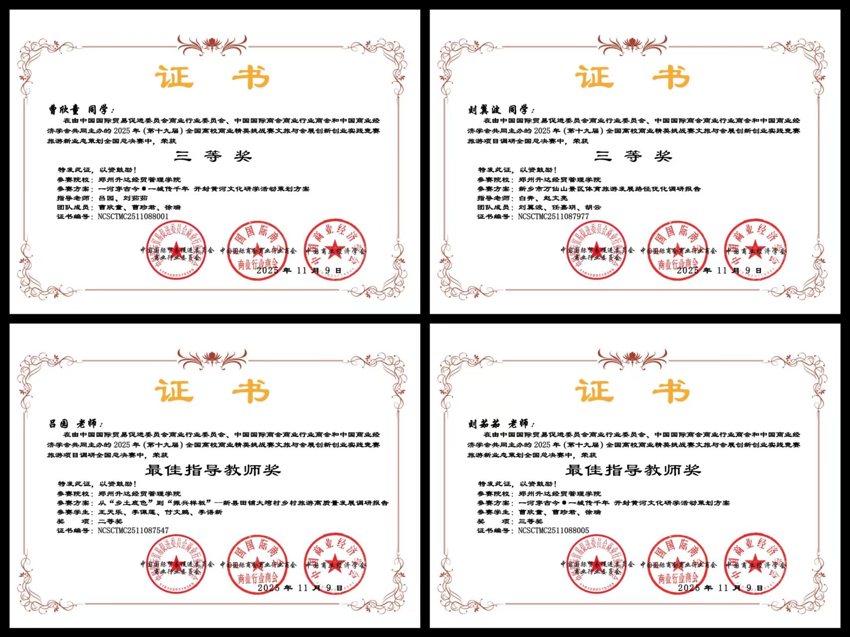 2025年10月25日,旅游管理专业学生在吕园、刘茹茹、白奔和王书丽老师指导下历经省赛、国赛,最终在第十九届全国高校商业精英挑战赛文旅与会展创新创业实践竞赛总决赛中,参赛团队凭借扎实的专业素养、创新的策划方案及出色的答辩能力,从全国数百所高校的数千支队伍中脱颖而出,斩获二等奖2项、三等奖4项,郑州升达经贸管理学院也因此荣获“最佳院校组织奖”。