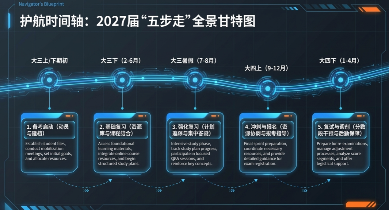 最后,会议重点确立了2027届考研指导计划,旨在推进考研工作常态化和制度化。该计划从大三上学期的备考启动开始,涵盖了基础复习、暑期强化复习、冲刺与报名指导,以及初试后的复试调剂保障五个关键阶段,并将利用专业核心课程的优势为学生梳理高频考点,通过建立涵盖数学、英语、政治及专业课的资源数据库,为学生提供全方位的学术支撑。