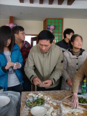 院长崔慕岳教授、院党委常务副书记戎庭银同志、张金安副院长等院领导向同学们示范并讲解包饺子的要领,几位院领导不仅包饺子速度快,而且所包饺子美观、大方,赢得在场的50多位同学阵阵掌声和欢呼声。这一感人场面真可谓是“屋外寒气隆隆,室内暖意融融”。