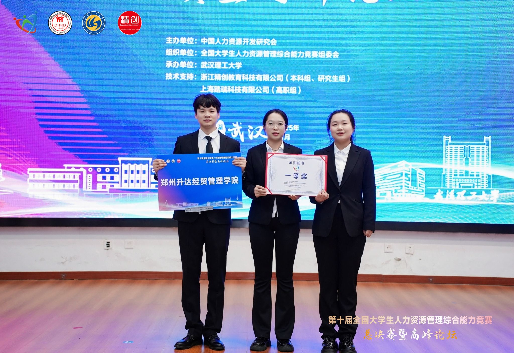 2025年11月9日,第十届全国大学生人力资源管理综合能力竞赛全国总决赛在武汉理工大学南湖校区顺利落幕。我校管理学院人力资源管理专业吴东炜、刘可欣、焦平汉3名学生组成的参赛团队,在指导教师蒋杨鸽、王丹丹的带领下,从全国百余支参赛队伍中突围,最终荣获全国一等奖。