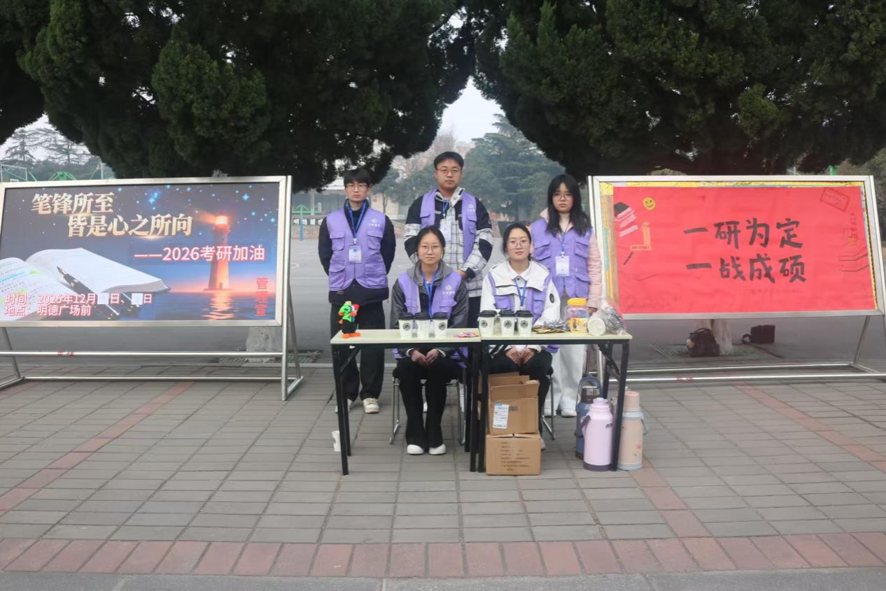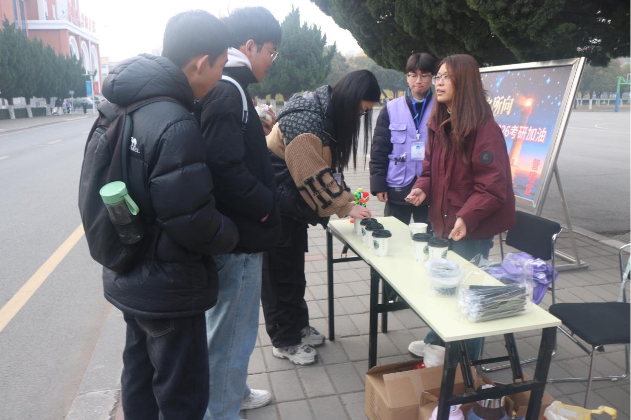 随着2026年研究生考试的临近,为切实关怀备战考研的学子,缓解备考压力、传递学院温情,管理学院举办“考研加油站”送温暖活动。管理学院心理部联合学习部于2025年12月10日至11日在明德广场,通过赠送热咖啡、糖果等方式,为坚守在备考一线的学子们送上冬日里的关怀与祝福。