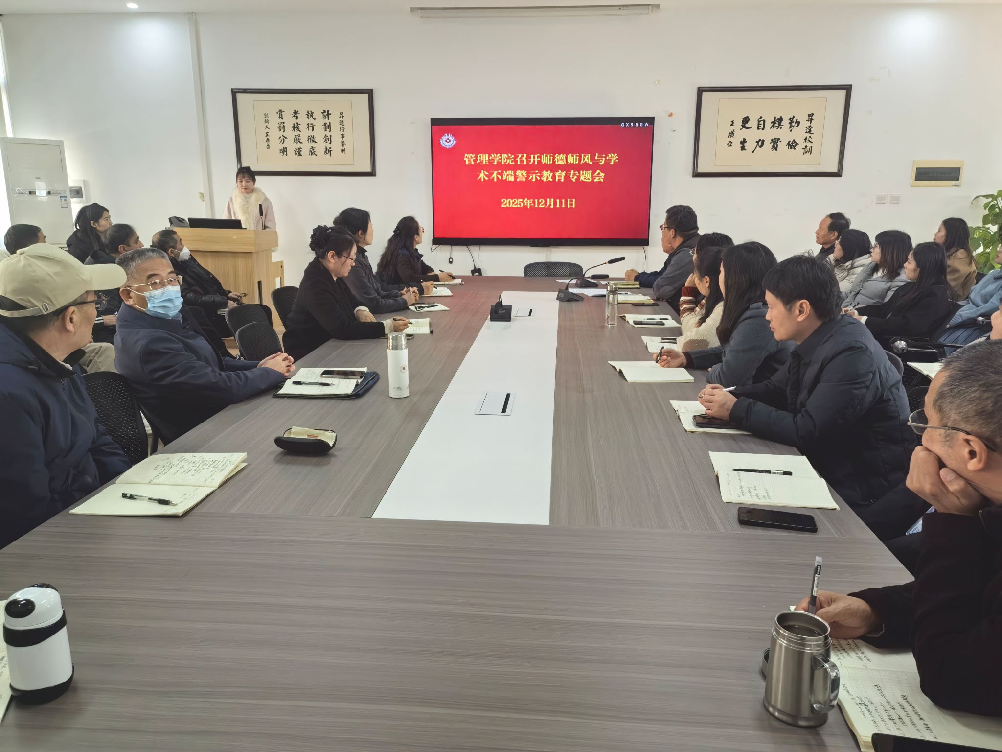2025年12月11日下午,管理学院在教学2号楼209会议室召开“师德师风与学术不端警示教育活动”专题学习会议。会议由管理学院党委书记职正路主持,学院全体教师参加了会议。