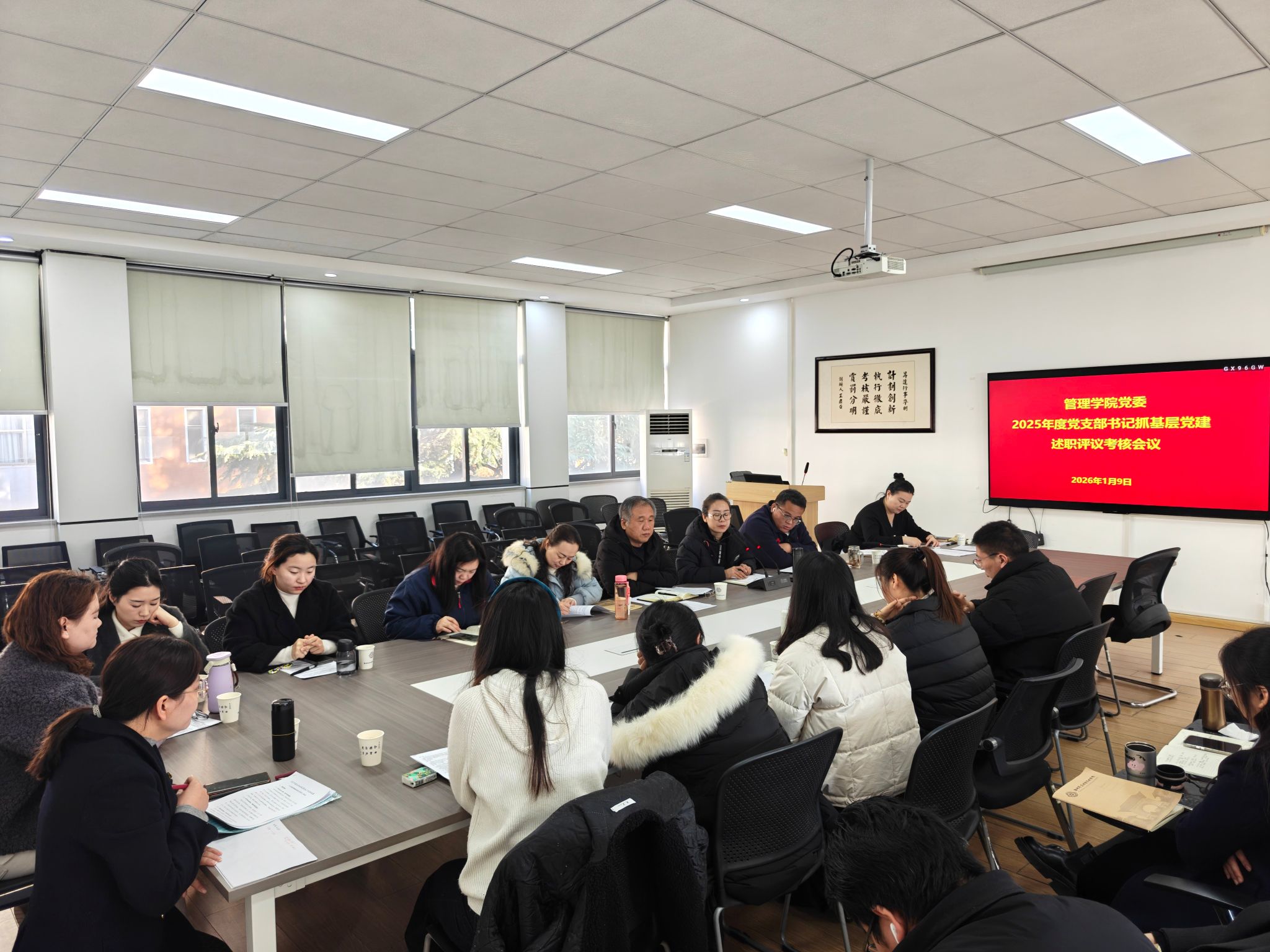 2026年1月9日上午,管理学院在教学2号楼209会议室召开2025年度党支部书记抓基层党建述职评议考核会议。管理学院党委书记职正路,党委副书记、院长朱影影,党委副书记许广庆及全体党委委员、党支部书记、党员代表、群众代表参加会议。会议由职正路主持。