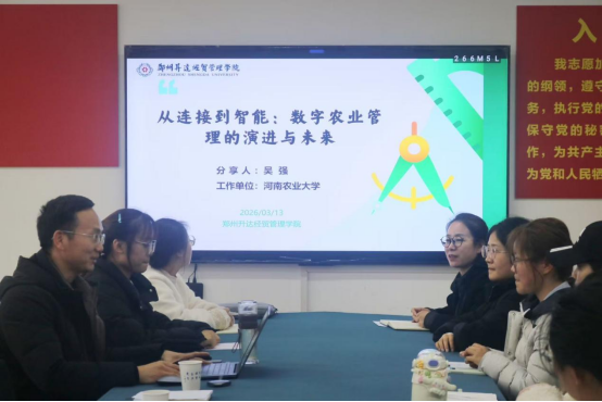 为深化学科交叉融合,紧跟数字农业前沿动态,3月13日下午,管理学院在2号楼305会议室成功举办了主题为“从连接到智能:数字农业管理的演进与未来”的专题学术交流会。本次交流会特邀河南农业大学农林经济管理系系主任吴强莅临主讲,管理学院院长朱影影、副院长李裔辉及学院相关专业教师、学生共同参加这项活动。