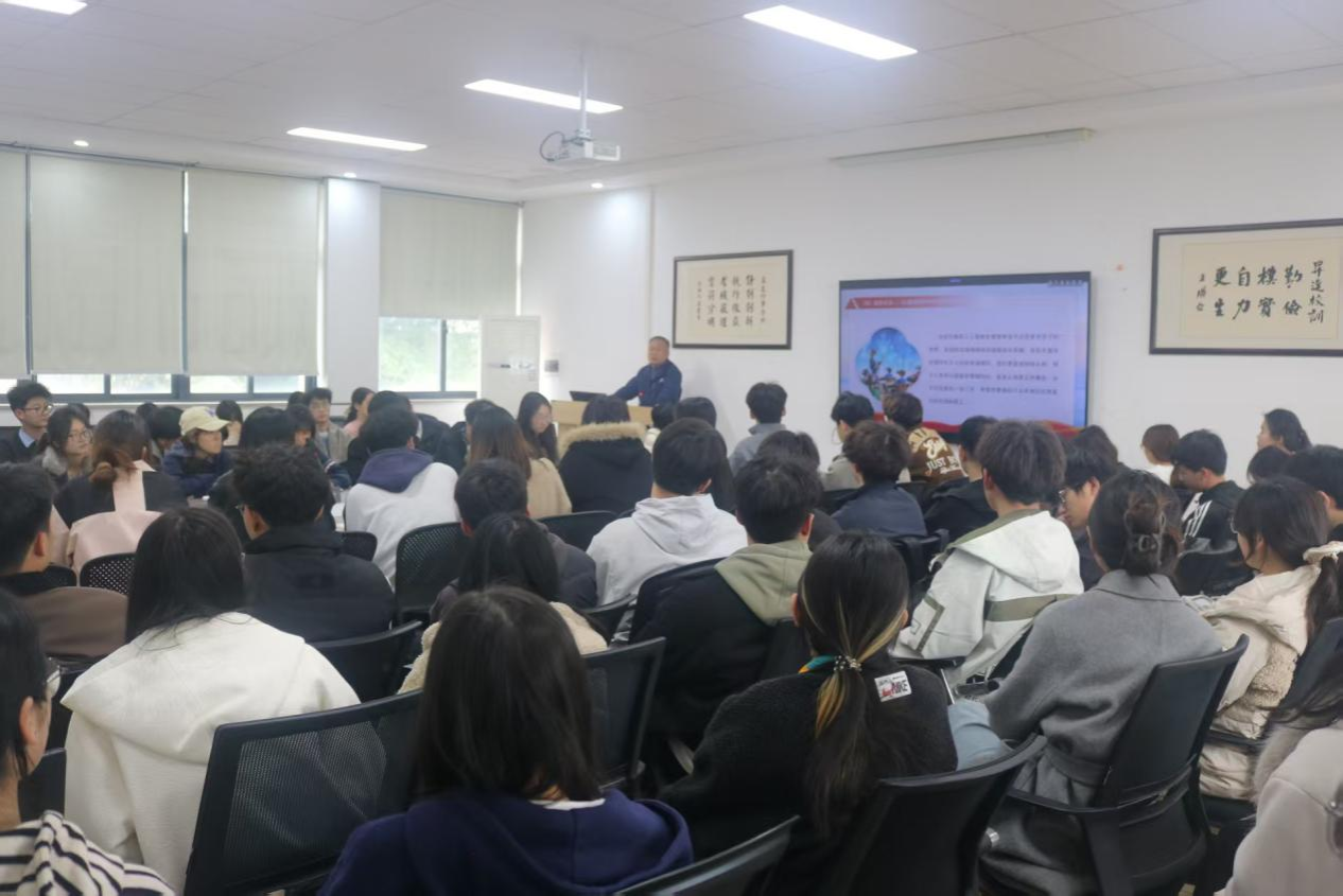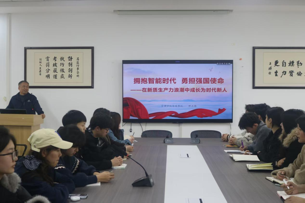 为深入学习贯彻党的二十届四中全会精神、2026年全国两会精神及全国、全省教育大会精神,3月23日下午,管理学院党委书记职正路以“拥抱智能时代 勇担强国使命”为题,在教学2号楼209会议室为学院团学干部及学生代表讲授2026年春季学期开学思政第一课,为青年学子的新学期成长之路注入思想动力、明晰奋进方向。