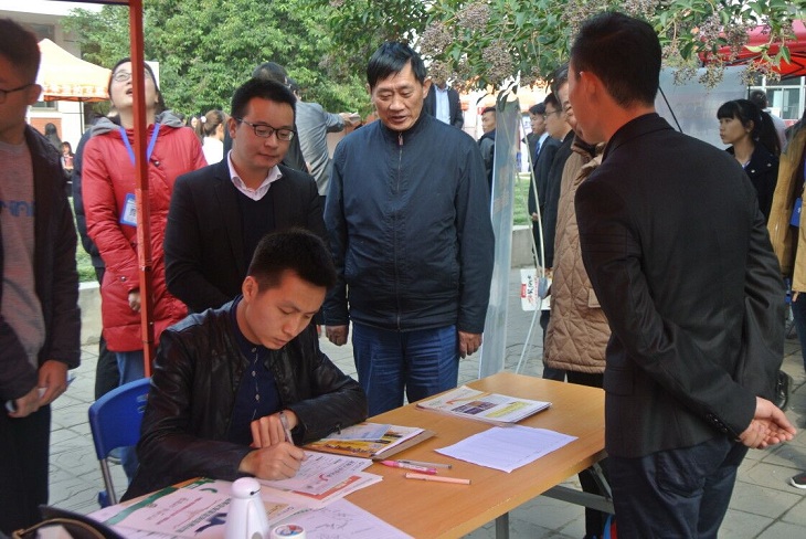 我院党委副书记戎庭银同志、团委书记秦旻老师、招生就业处处长刘景向老师、就业辅导科科长冯科老师在我系系主任纪德尚教授、党总支书记张小雁同志和副主任唐云老师的陪同下出席了招聘会。